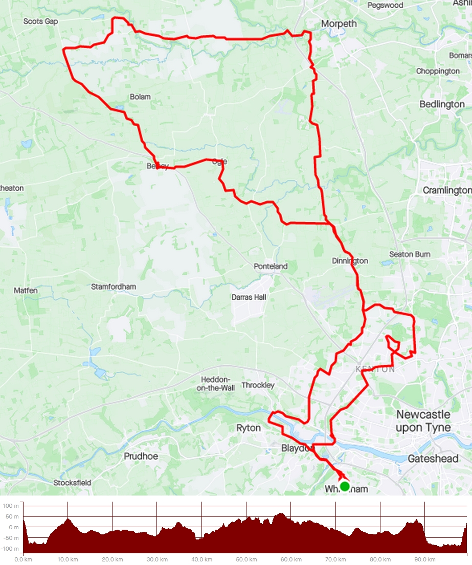 The Mur de Mitford was as gnarly as expected, but I managed to haul myself up with only minimal wheel slip. We then ranged across the top of the Wansbeck valley instead of descending to follow the river west, avoid a direct confrontation with a headwind at the expense of some rolling terrain and several stiff climbs.